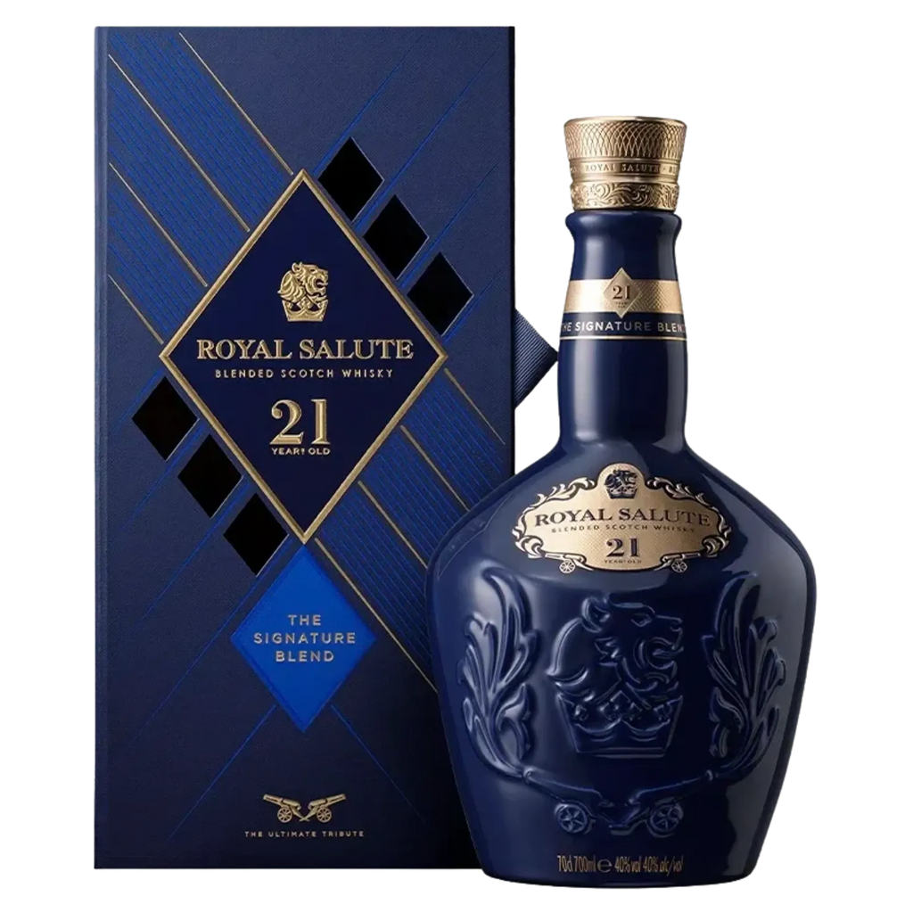 O nome Royal Salute refere-se à tradicional salva de 21 tiros disparada em honra à realeza britânica — um símbolo de respeito e reverência. Criado em 1953, o Royal Salute foi especialmente desenvolvido para marcar a coroação da Rainha Elizabeth II, e cada garrafa representa essa herança aristocrática. A produção é feita com extrema atenção aos detalhes, e a garrafa de porcelana Wade, feita à mão, torna cada unidade uma peça de coleção. A combinação entre tradição escocesa, excelência no envelhecimento e requinte visual faz deste whisky uma verdadeira obra-prima.